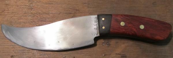 一旦刀背呈现梅子色,刀刃呈现小麦色时,立即浸入油中固定。用金刚砂纸清洁刀身。下一步是将刀柄安装到刀上。