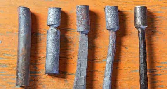 加热钢条并切割到所需长度。用锤子将末端锥成尖端。尖端的末端应该是平的。通过反复敲打和旋转来圆滑锥形的边缘。