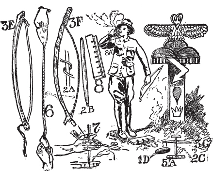是一根木棍或树枝(图3、3E、3F和3G),大约一英尺半长,直径近一英寸,有一个永久的弯曲——这个弯曲可能是天然的,也可能是人工制作的。弓上连接着一根松弛的皮带或某种耐用的绳子。爱斯基摩人比印第安人更有创造力,他们用象牙制作精美的弓,从海象牙上雕刻,将其削薄并用一条松散的海象皮条穿起来。