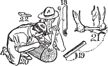 我在丛林工艺营地(Woodcraft Camp)的学生们成功地用椅子的横档作为纺锤,用包装箱的一块木板作为火板,另一块作为插孔木,用他们鹿皮靴的绳子作为弓弦来生火。然而他们没有使用弓,需要两到三个男孩来生火,一个拿着纺锤,另外两个在鹿皮靴绳子上锯动([图17])。