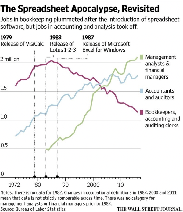 与此同时,像Excel这样的电子表格应用程序并没有消灭会计工作——它们帮助创造了更多工作