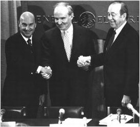 1985年在纽约市与鲍勃·弗雷德里克和桑顿·“布拉德”·布拉德肖宣布63亿美元的RCA交易。照片由GE提供