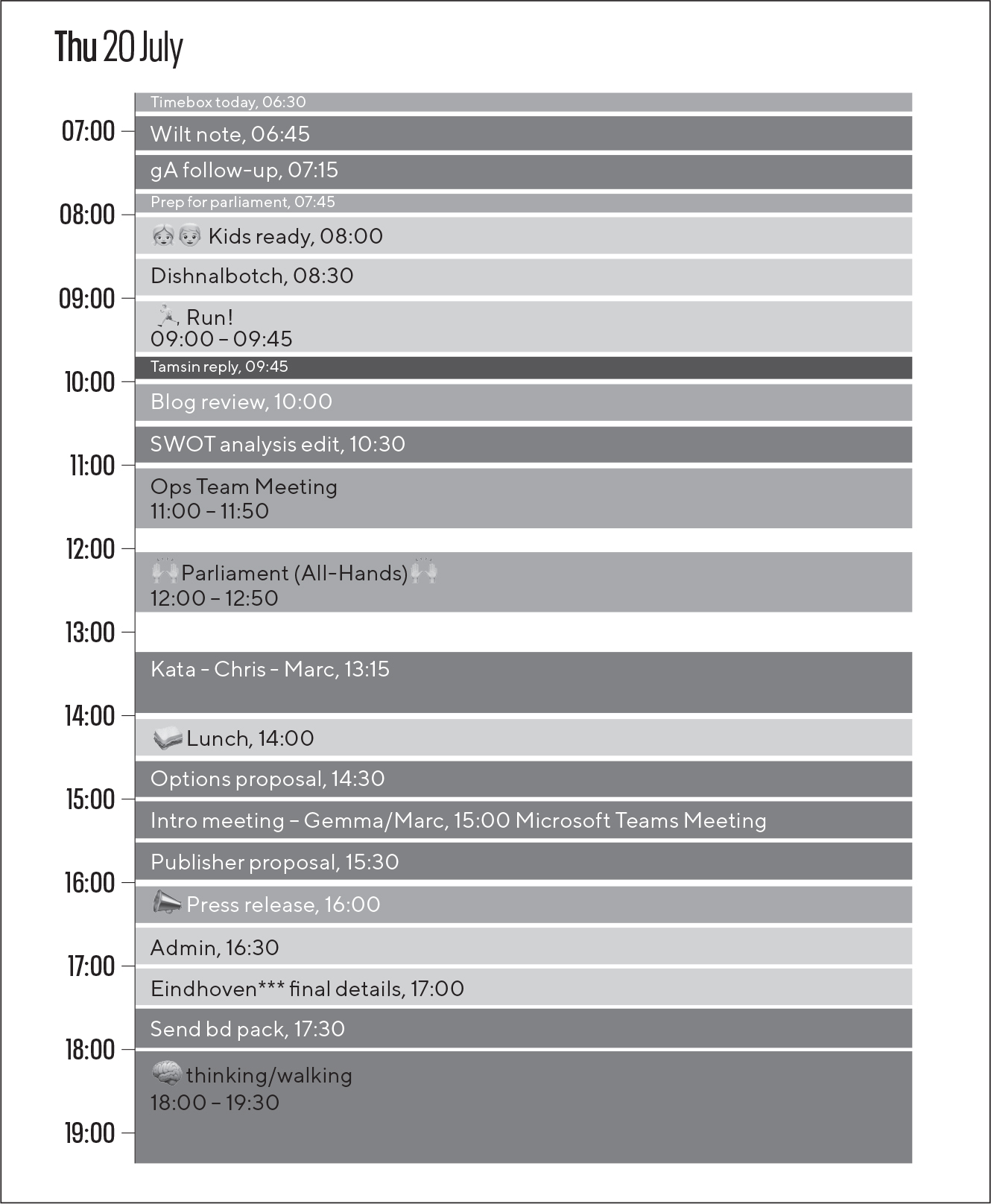 然而,这不仅仅关乎工作。Timeboxing还允许我和我的团队添加其他重要的生活事件,如自主学习、反思、与孩子和家人相处的时间、午餐、家务(快乐!),甚至遛狗!