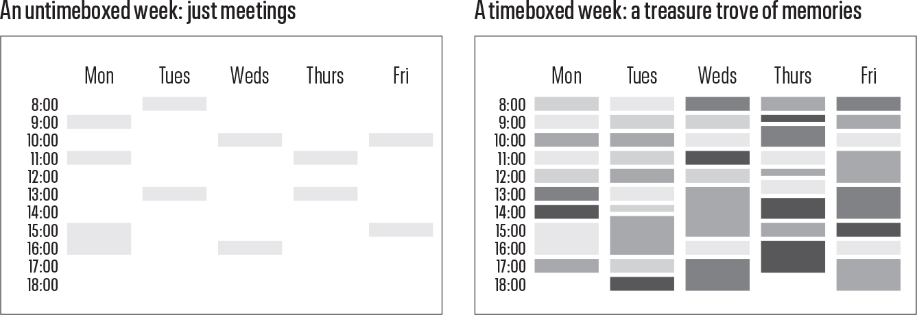 你会比我更快地达到时间盒的卓越水平。我通过试错发现的10年收益,你可以在不到一个月内获得。更好的是,你会发展出自己的版本,为你的环境和生活量身定制。