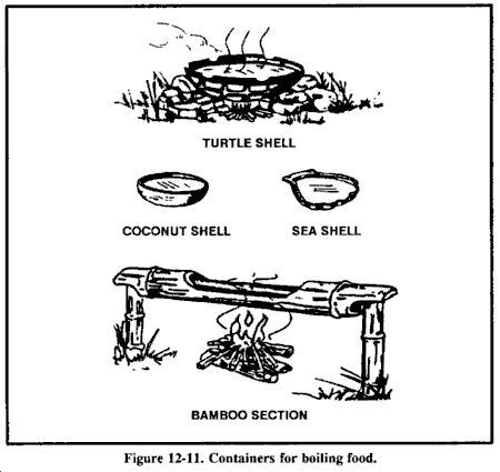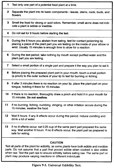 食物获取,像水源获取一样,并非不可能,但您必须采取特殊预防措施。您的作战口粮是密封的,您可以假设它们没有被污染。您也可以假设密封容器或包装的加工食品是安全的。为确保安全,通过用肥皂和水清洗或在水中煮沸容器10分钟来对所有食物容器进行去污处理。您仅在极端紧急情况下才考虑用当地植物或动物补充口粮。无论您如何准备食物,都无法保证烹饪能杀死所有生物病原体。仅在生死攸关的情况下使用当地食物。记住,您可以在没有食物的情况下存活很长时间,特别是如果您吃的食物可能会杀死您!