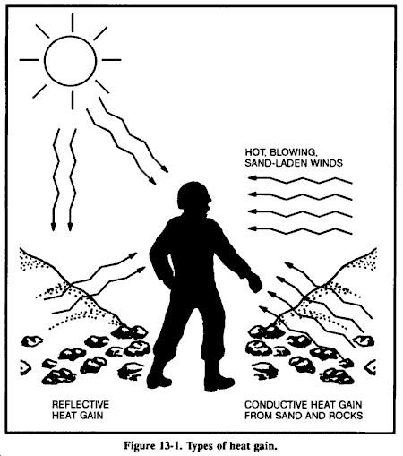 即使在最理想的情况下,大自然也相当可怕。在生存中,士兵必须应对天气、地形和栖息在某个地区的各种生物的压力源。炎热、寒冷、雨水、风、山脉、沼泽、沙漠、昆虫、危险爬行动物和其他动物只是等待努力生存的士兵面临的一些挑战。根据士兵如何处理环境压力,他的周围环境可以成为食物和保护的来源,也可以成为导致受伤、疾病或死亡的极度不适的原因。