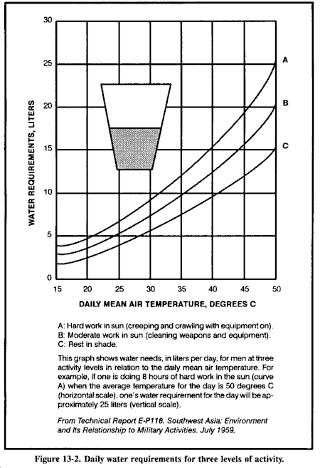 没有食物和水,人会虚弱并最终死亡。因此,随着在生存环境中时间的增加,获取和保存食物和水变得越来越重要。对于习惯了配给供应的士兵来说,觅食可能是一个很大的压力源。