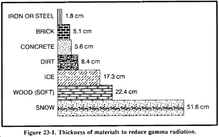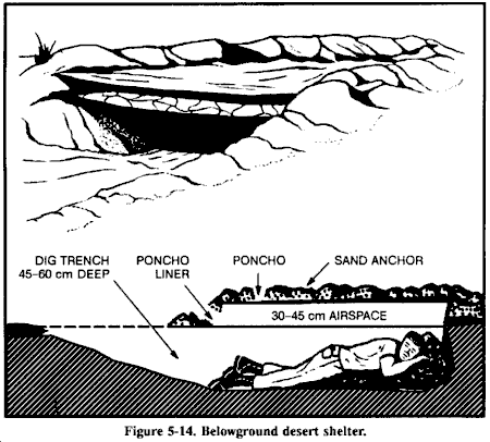 挖掘战壕时,一旦战壕足够大能够覆盖身体的一部分,就从战壕内部工作,这样不会将整个身体暴露在辐射中。在开阔地区,尝试从俯卧位置挖掘战壕,小心均匀地将土壤堆积在战壕周围。在平地上,将土壤堆积在身体周围以获得额外屏蔽。根据土壤条件,避难所建造时间从几分钟到几小时不等。如果尽可能快地挖掘,将减少接受的剂量。