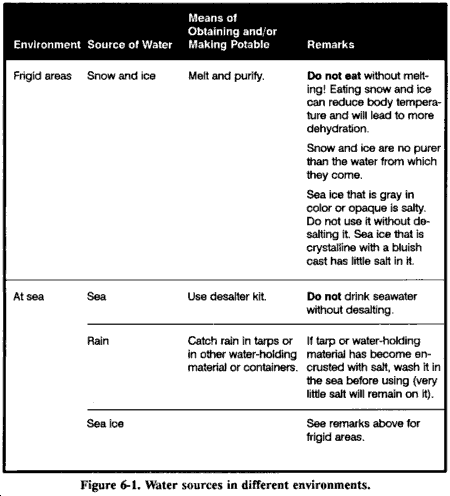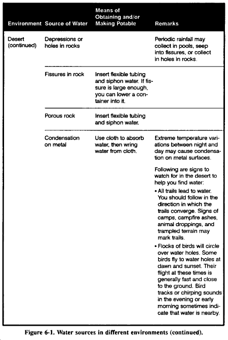 与生物和核环境一样,在化学环境中获取水是困难的。显然,密封容器中的水是你最好和最安全的来源。你必须尽可能保护这些水。打开前一定要净化容器。如果你无法获得密封容器中的水,尝试从封闭源头获取,如地下水管。如果没有污染迹象,你可以使用雨水或雪。如有必要,使用缓流溪流的水,但总是先检查污染迹象,并始终按照核条件下描述的方法过滤水。水源污染的迹象包括异味,如大蒜、芥末、天竺葵或苦杏仁味;水面或附近的油斑;以及死鱼或动物的存在。如果存在这些迹象,不要使用该水。始终煮沸或净化水以防止细菌感染。
