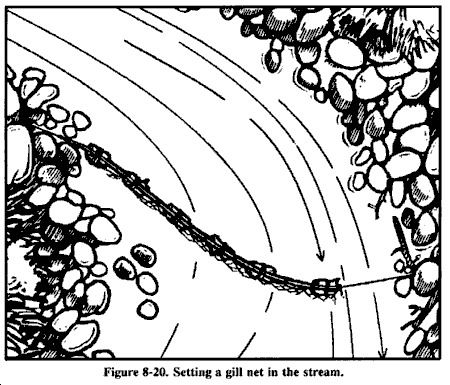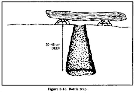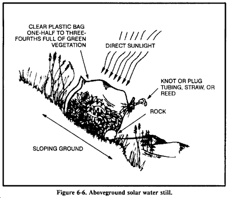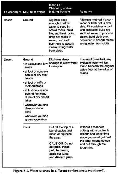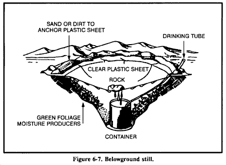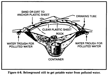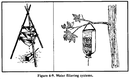 来自溪流和河流的水在最后一次核爆炸后几天内会因为稀释而相对不含fallout。如果完全可能,在饮用前过滤这种水以除去放射性微粒。最佳过滤方法是在水源旁边挖掘沉积孔或渗透池。水将通过起过滤作用的中间土壤横向渗入孔中,并去除沉积在原始水体上的污染fallout微粒。这种方法可以去除水中高达99%的放射性。你必须以某种方式覆盖这个孔以防止进一步污染。参见图6-9的水过滤器示例。