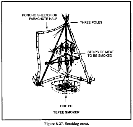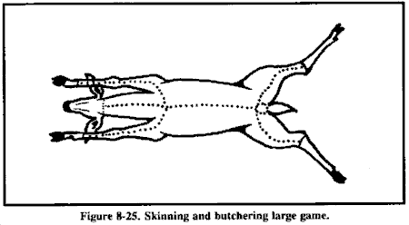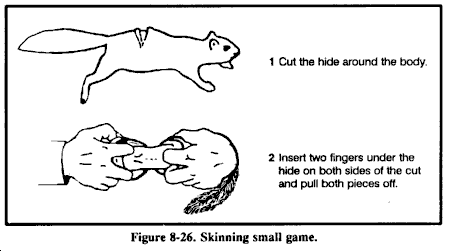 仔细剥皮所有动物,以防止皮肤或毛皮上的任何放射性颗粒进入体内。不要吃靠近骨骼和关节的肉,因为动物的骨骼含有超过90%的放射性。然而,剩余的动物肌肉组织食用起来是安全的。在烹饪之前,从骨头上切下肉,在骨头上留下至少3毫米厚的肉。丢弃所有内脏器官(心脏、肝脏和肾脏),因为它们往往集中β和γ放射性。将所有肉类煮得非常熟。为确保肉类煮熟,在烹饪前将其切成厚度不超过13毫米的片。这样的切割还可以减少烹饪时间并节省燃料。