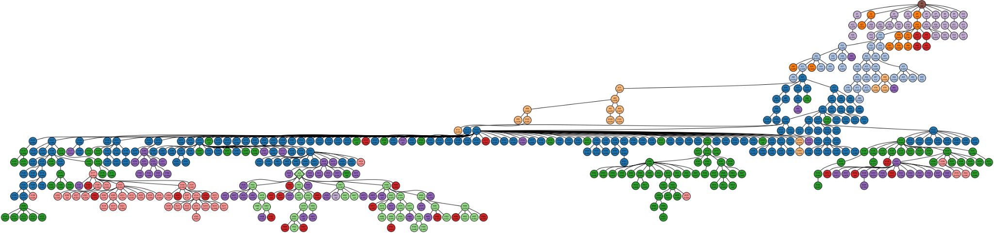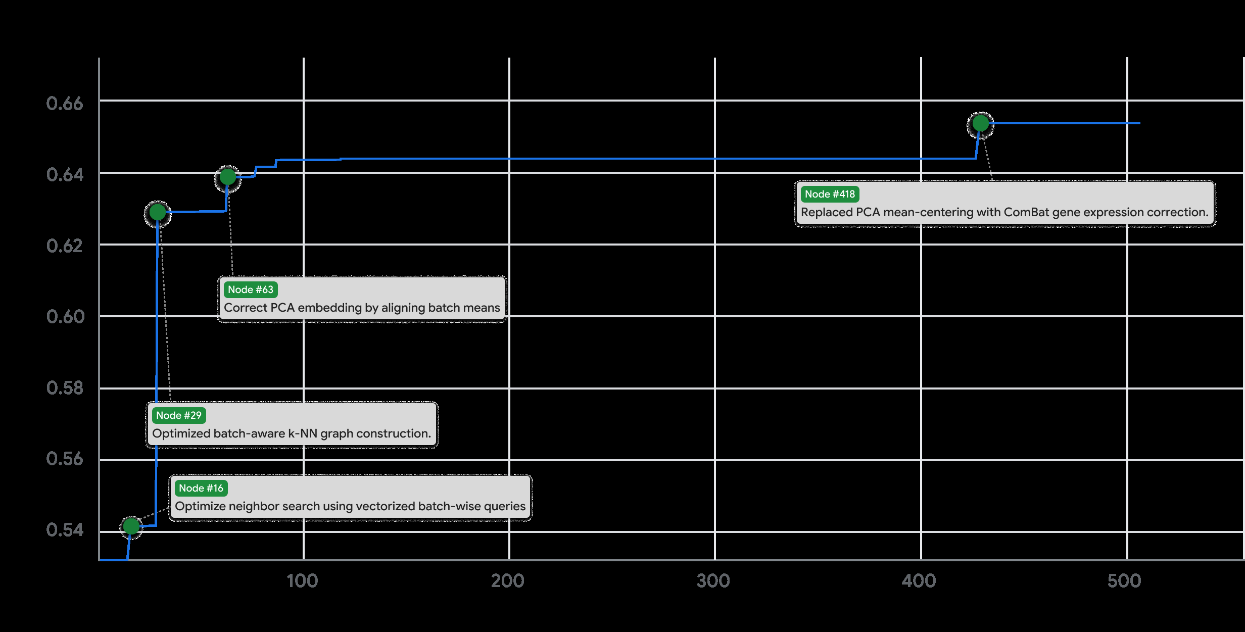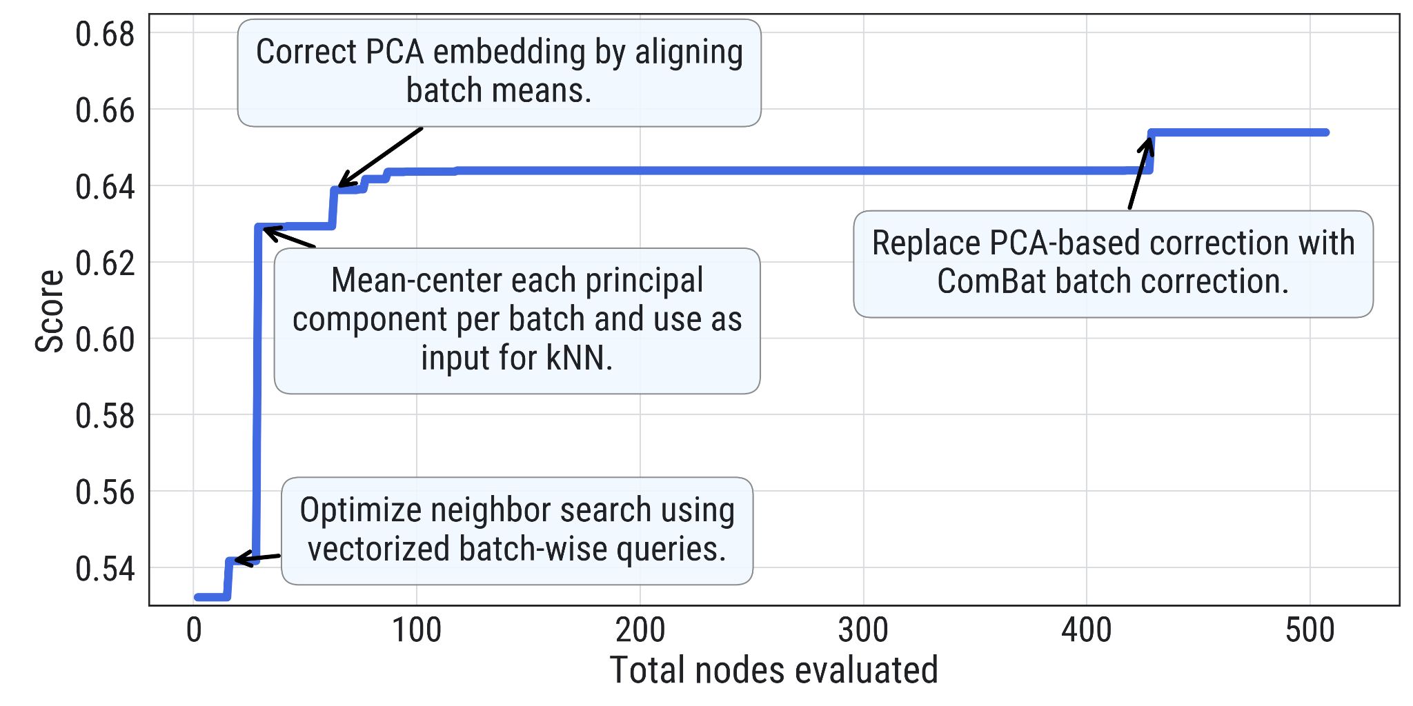 性能最佳的方法是我们基于批次平衡K近邻([38] BBKNN (TS))的树搜索实现,与最佳已发表方法([37] ComBat)相比总体改进了14%,并且在每个数据集和13个指标中的11个上等于或超越了相应的已发表BBKNN(图[2b])。这种性能突出了其在不损害生物信号的情况下有效去除批次效应的能力(补充图[2])。我们注意到树搜索还能够为没有公开可用代码的算法产生高性能实现(TabVI[39],补充图[3])。重要的是,专家对我们方法提出的代码解决方案的手动检查证实,几乎所有实现都遵循了所请求的算法(补充表[5]),性能在方法的重复运行中基本一致(补充图[3])。此外,即使与具有优化超参数的基础方法相比,树搜索也显示出改进,表明其贡献超出了超参数调优(方法,补充图[4])。补充图[5]显示了代表性示例的树结构和突破图(显示最大分数随树中节点数量的演化)。