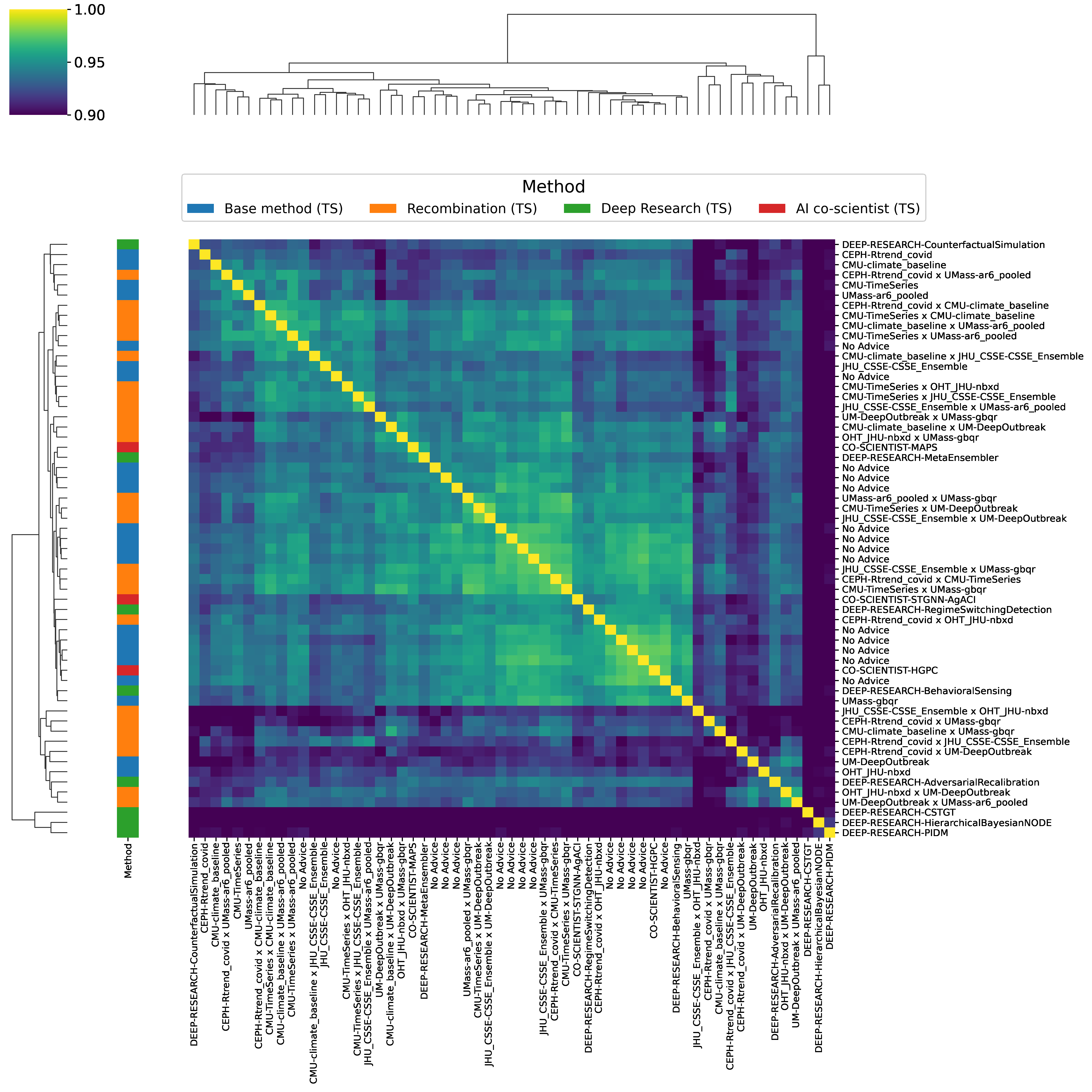 重组、五种基础方法和两种未达到其性能的AI协作科学家方法