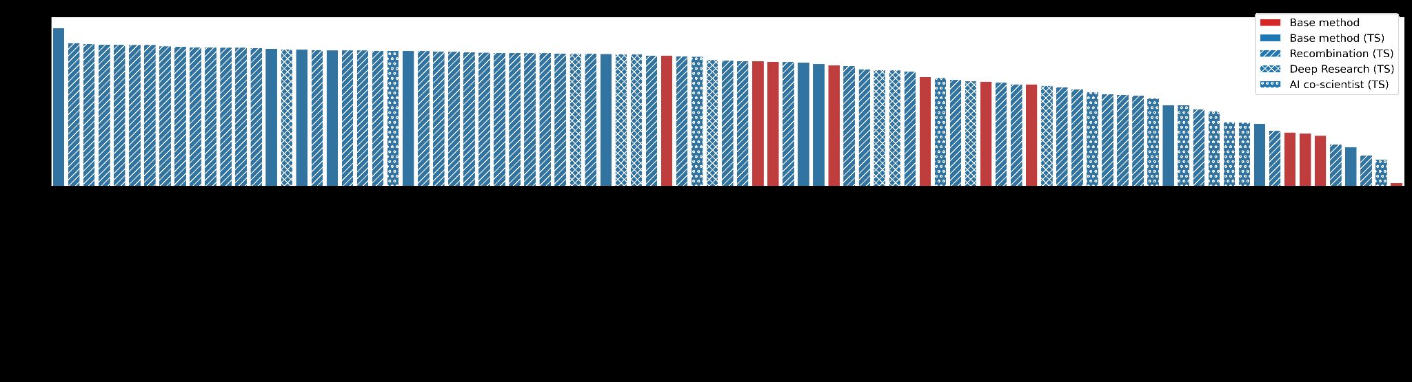 思想重组)、Gemini Deep Research [35] [36]和我们的AI协作科学家方法的总体得分。Y轴下界