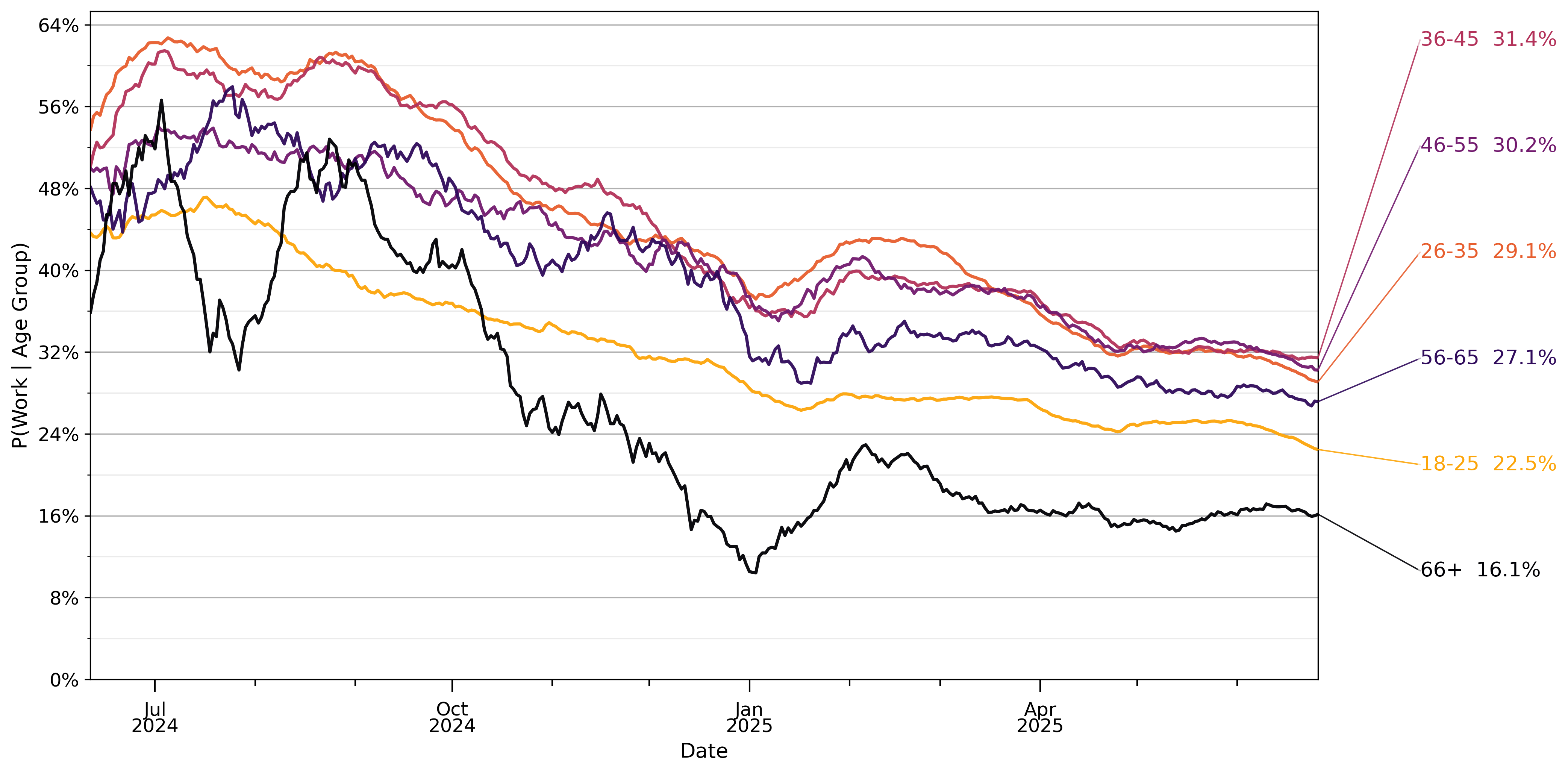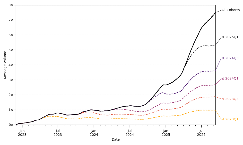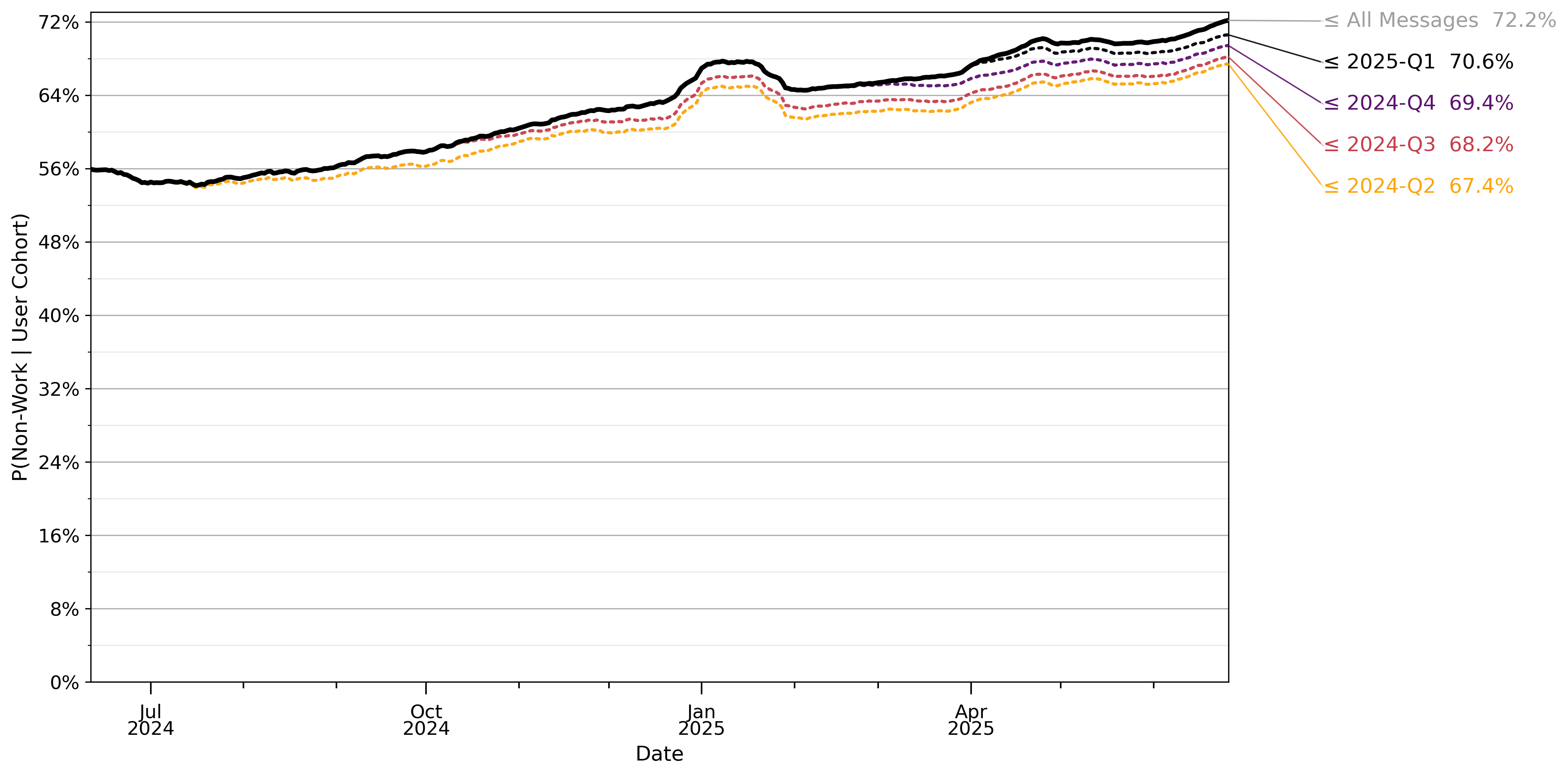 图[4]还显示了各个用户群体对总消息量的贡献。黄线代表ChatGPT的第一批用户群体:他们的使用量在2023年有所下降,但在2024年底开始再次增长,现在比以往任何时候都高。粉线代表2023年第三季度或更早注册用户的消息,因此