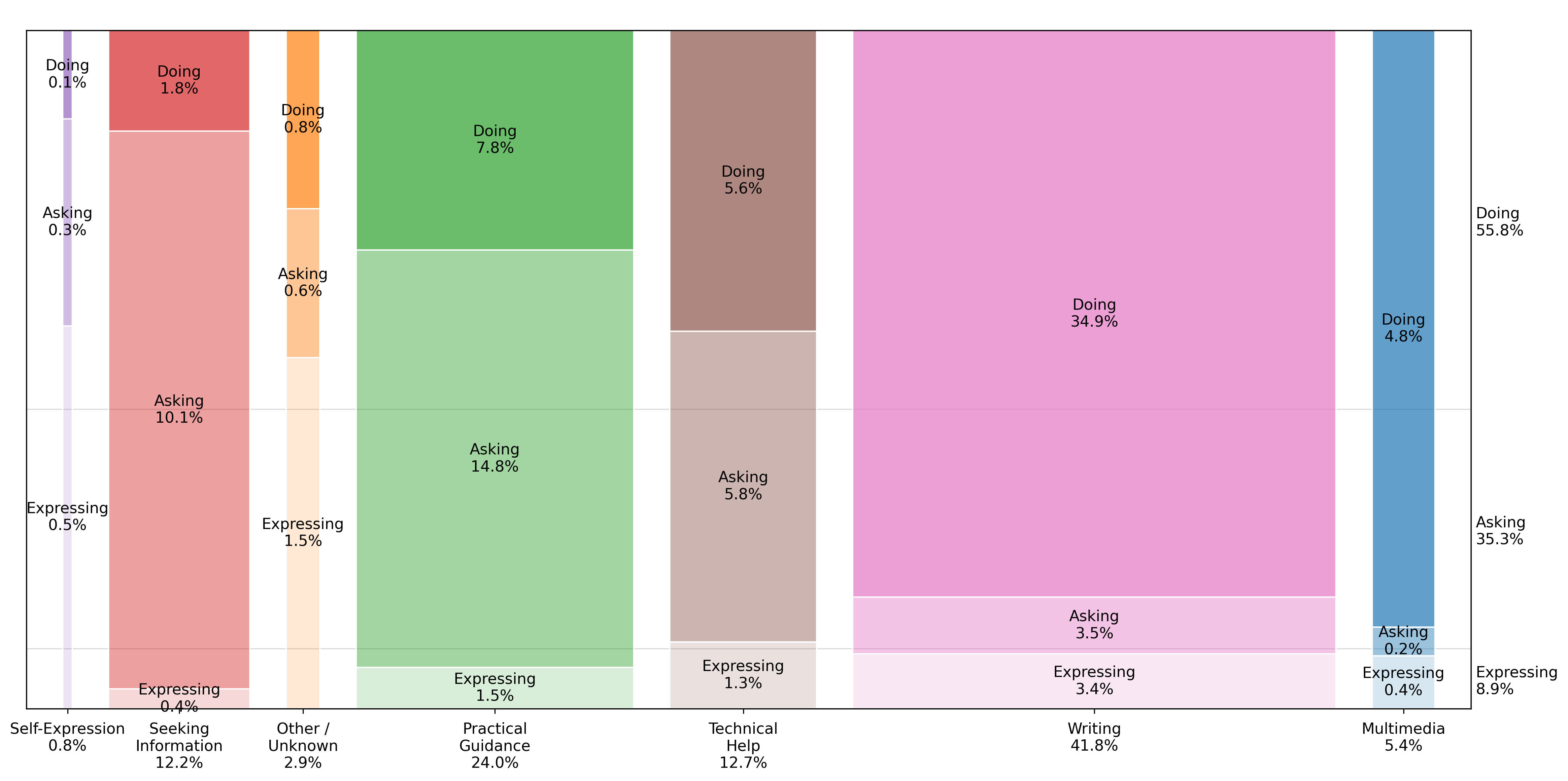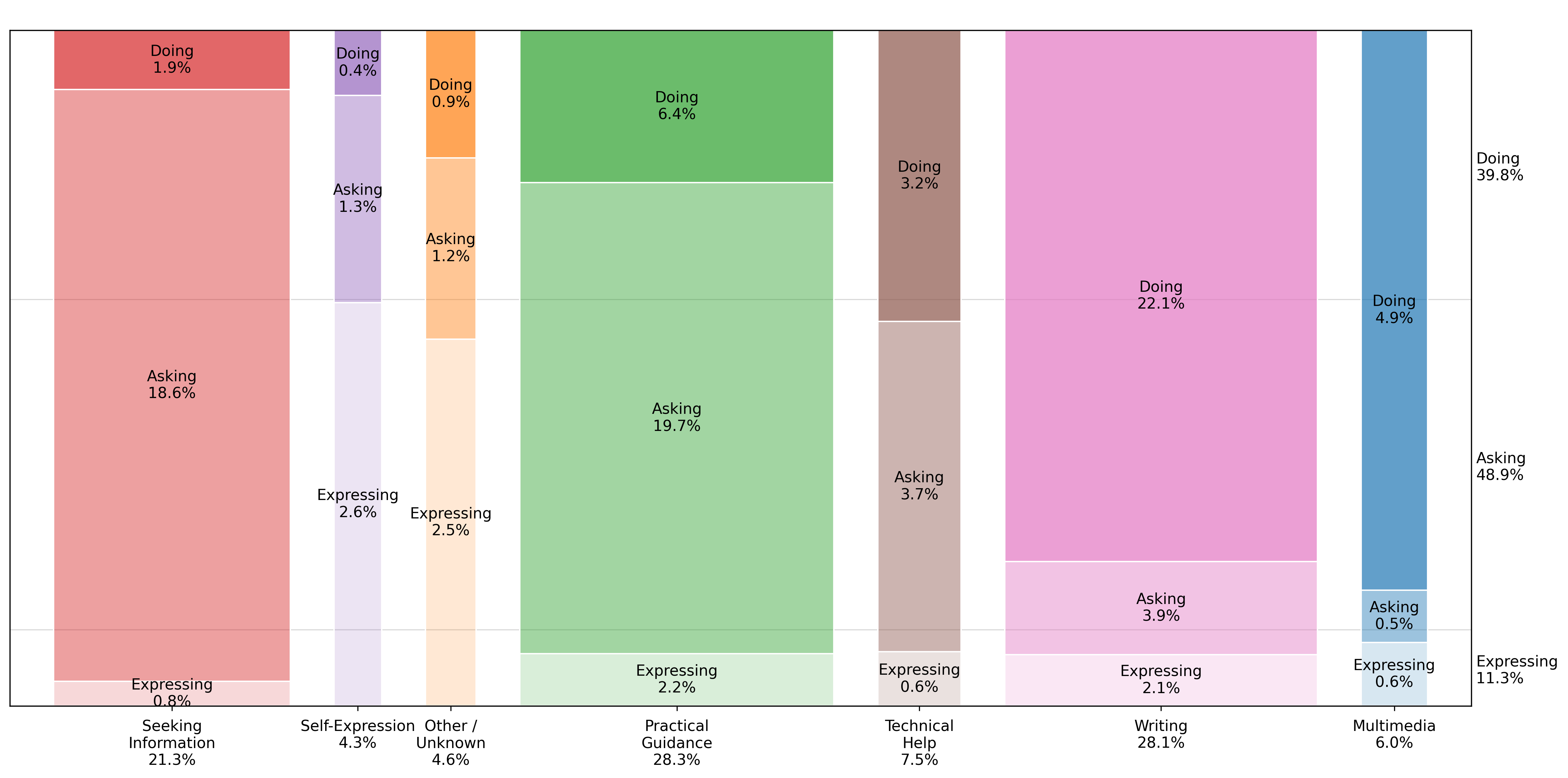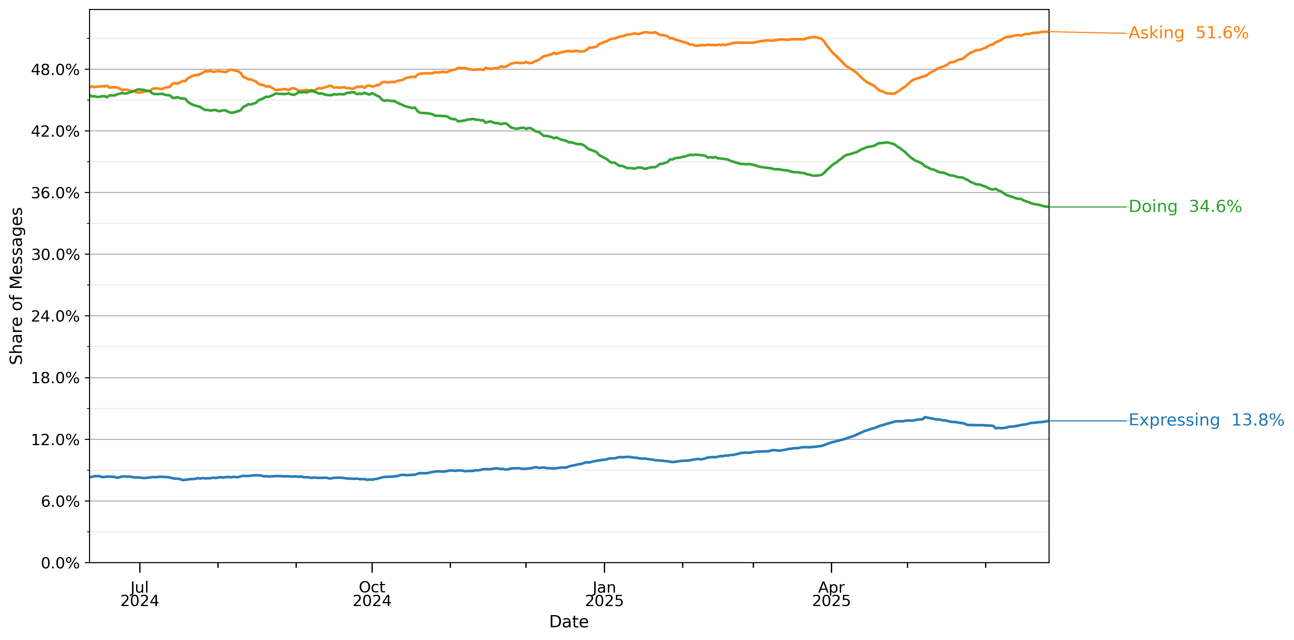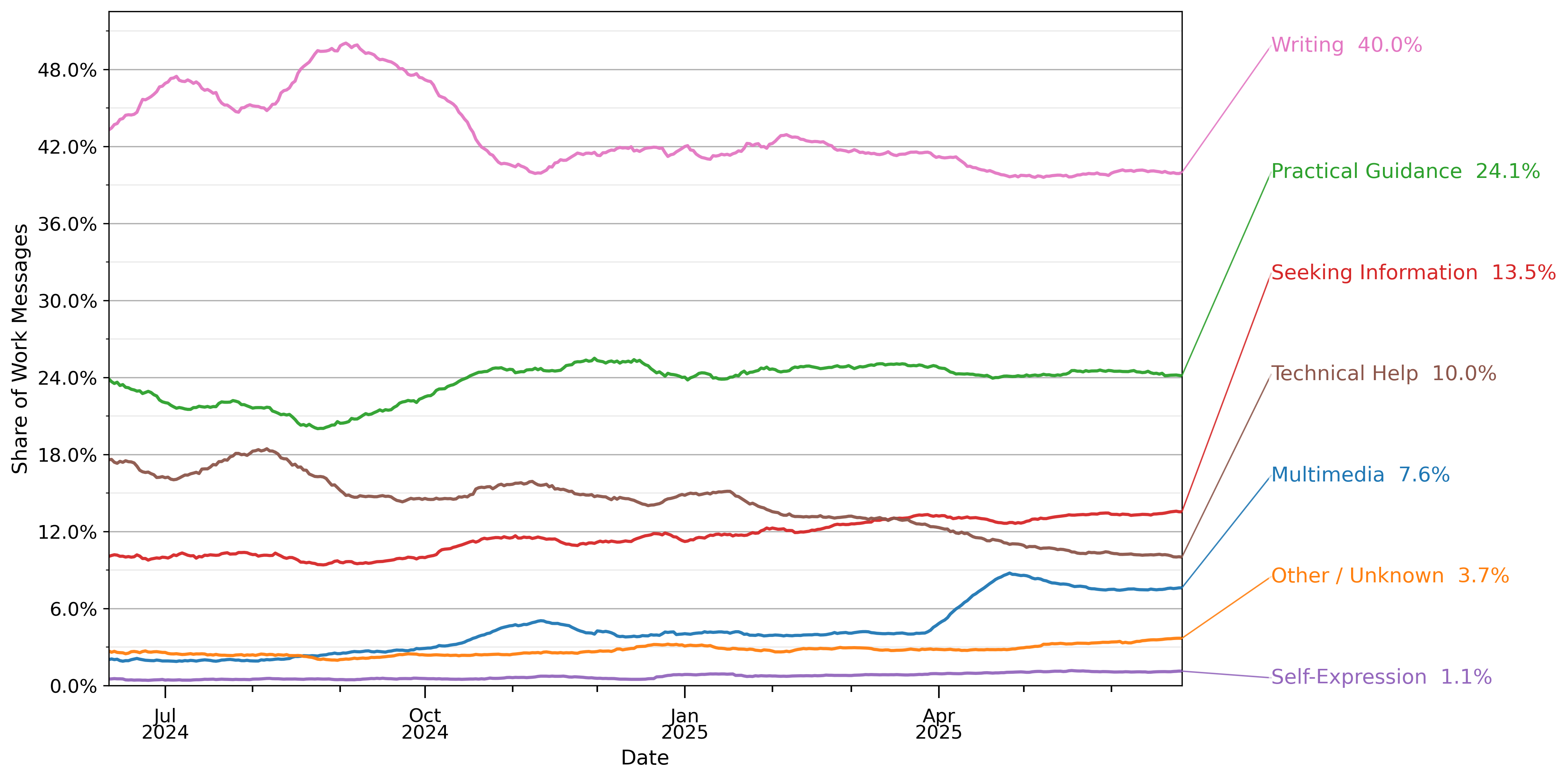 或执行特定任务,对应于经典的基于任务的工作模型(例如,Autor等人,2003年)。表达是指用户表达观点或感受,但不寻求任何信息或行动。我们估计大约49%的消息是询问(Asking),40%是执行(Doing),11%是表达(Expressing)。然而,截至2025年7月,大约56%的工作相关消息被归类为执行(例如,执行工作任务),其中近四分之三是写作任务。写作相关对话的相对频率值得注意,原因有二。首先,写作是几乎所有白领工作都常见的任务,良好的书面沟通技能是雇主最需要的”软”技能之一(全国大学与雇主协会,2024年)。其次,生成式AI相对于其他信息技术的一个显著特征是它能够产生长篇输出,如写作和软件代码。