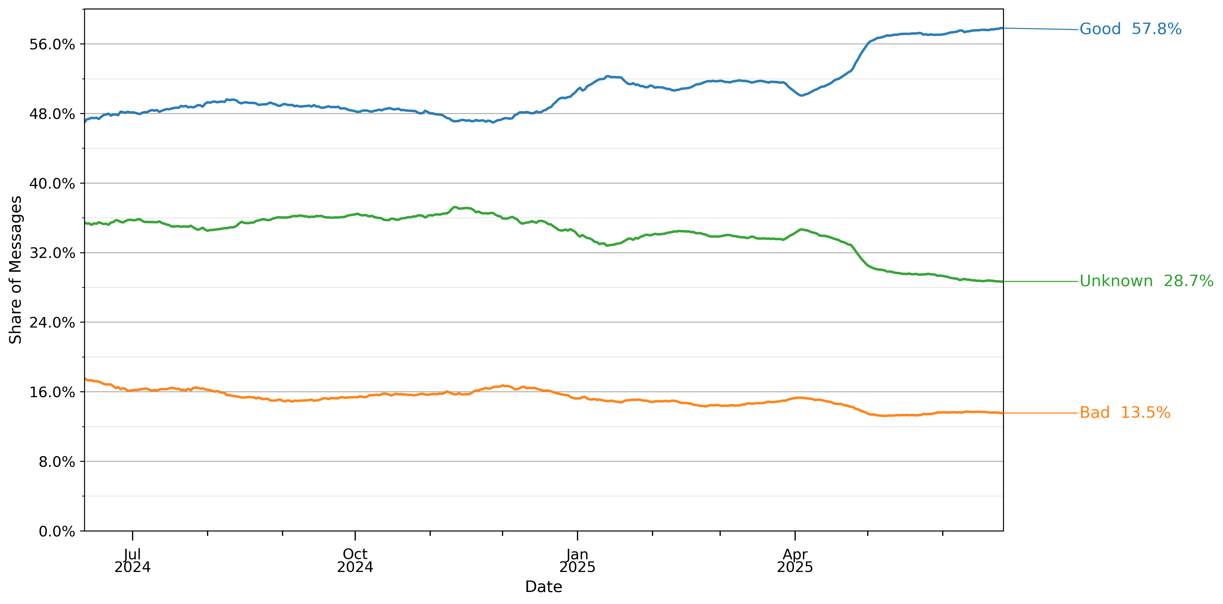 [针对有电子邮件地址的账户。但是,来自未登录用户的消息在我们的数据集中仅从] [2025年3月开始提供,因此为了保持一致性,我们删除了所有来自未登录用户的消息。]
