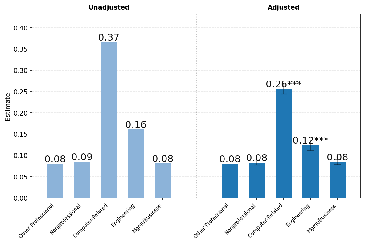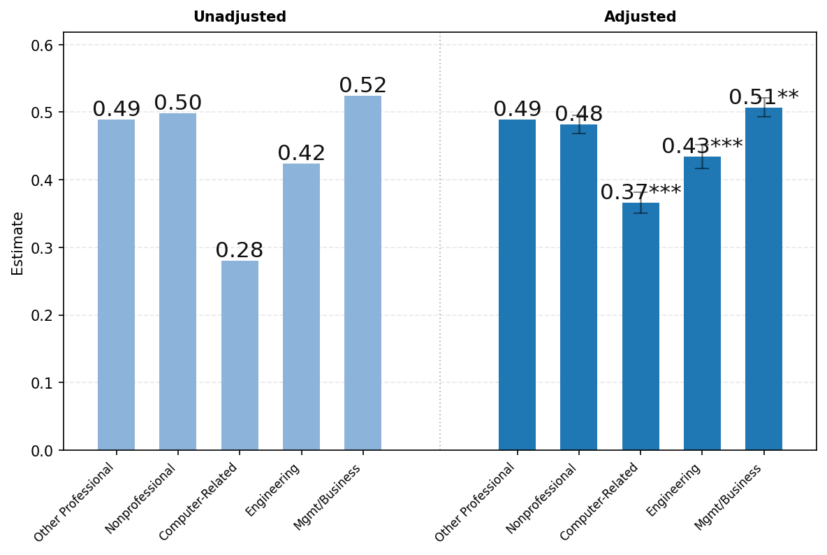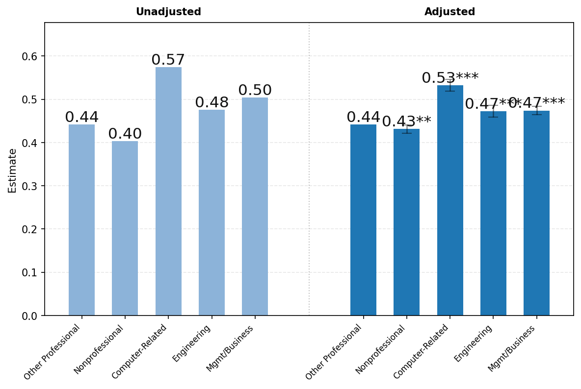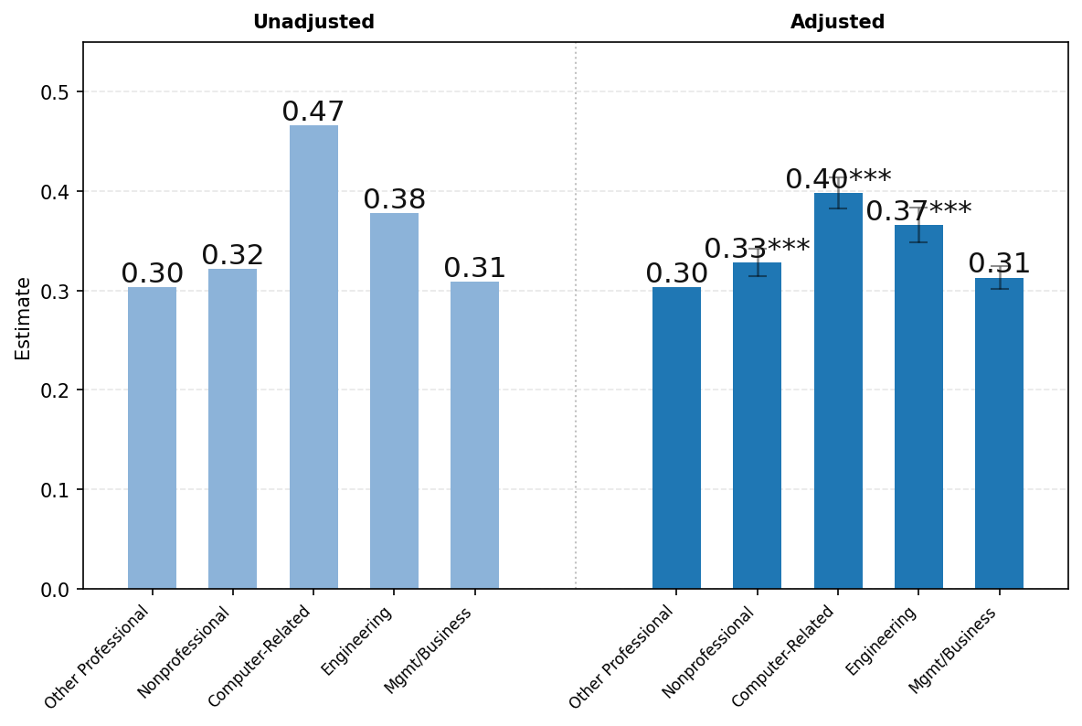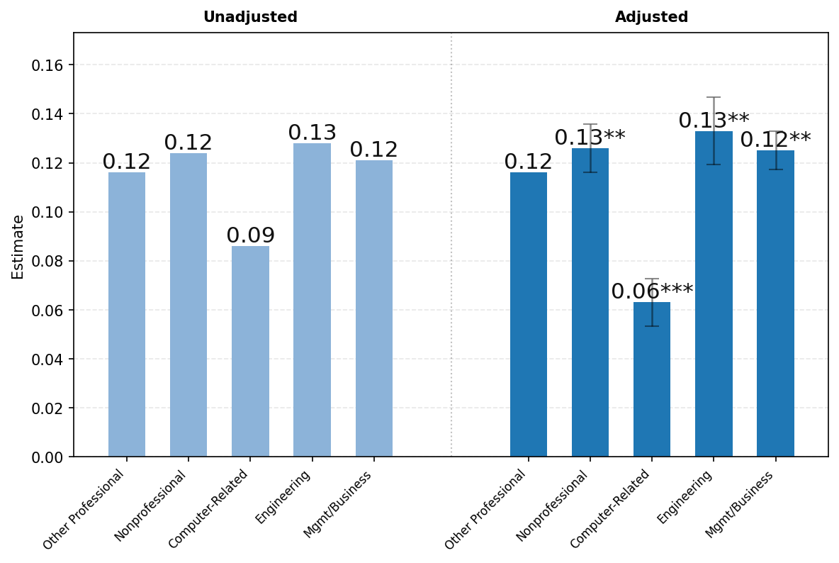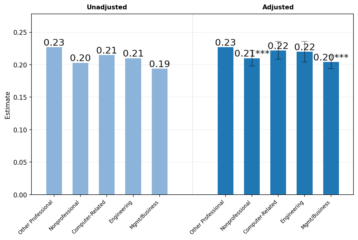 我们基于消费者ChatGPT用户样本的公开可用数据,对聚合就业类别进行了有限分析。该样本包括大约130,000名免费版、增强版和专业版用户,就业类别由供应商通过安全数据洁净室(Data Clean Room, DCR)进行聚合。在此分析中,我们使用与消息级数据集相同的排除标准:我们排除了停用用户、被禁用户、选择退出训练的用户,以及自报年龄低于18岁的用户。由于数据仅适用于用户子集,结果可能不代表完整的用户群体。