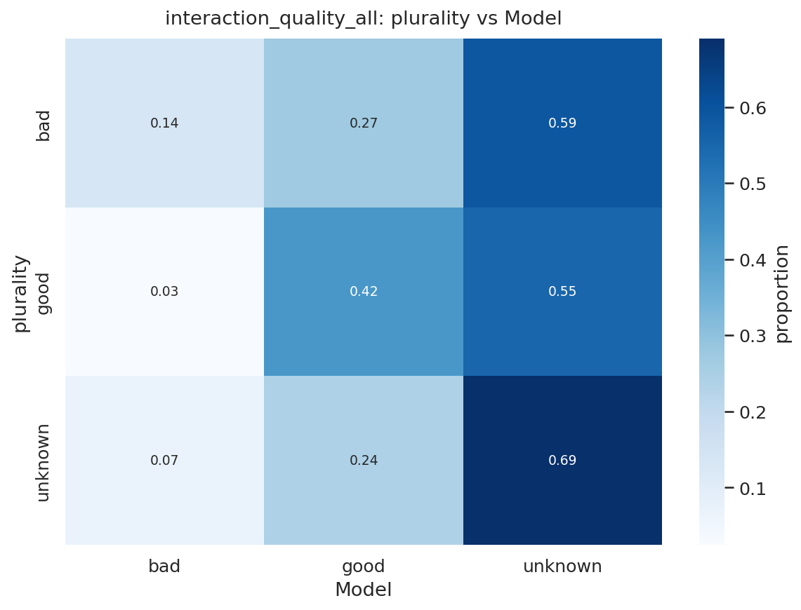 人类和模型的交互质量标注是嘈杂的。分类器与人类多数只达到轻微一致性(Cohen’s κ = 0.14),低于同样适度的平均人-人