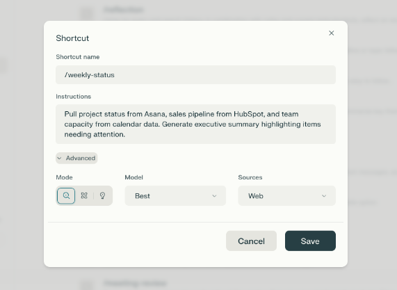 示例设置:将您最优秀的三份客户演示文稿、季度报告和提案文档上传到一个Space,并提供关于您的行业重点、目标受众和沟通偏好的说明。所有未来的内容生成都将保持这种既定的专业标准和语调。