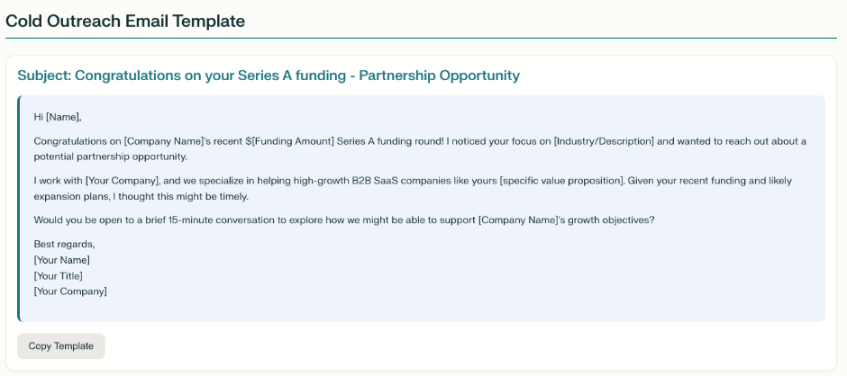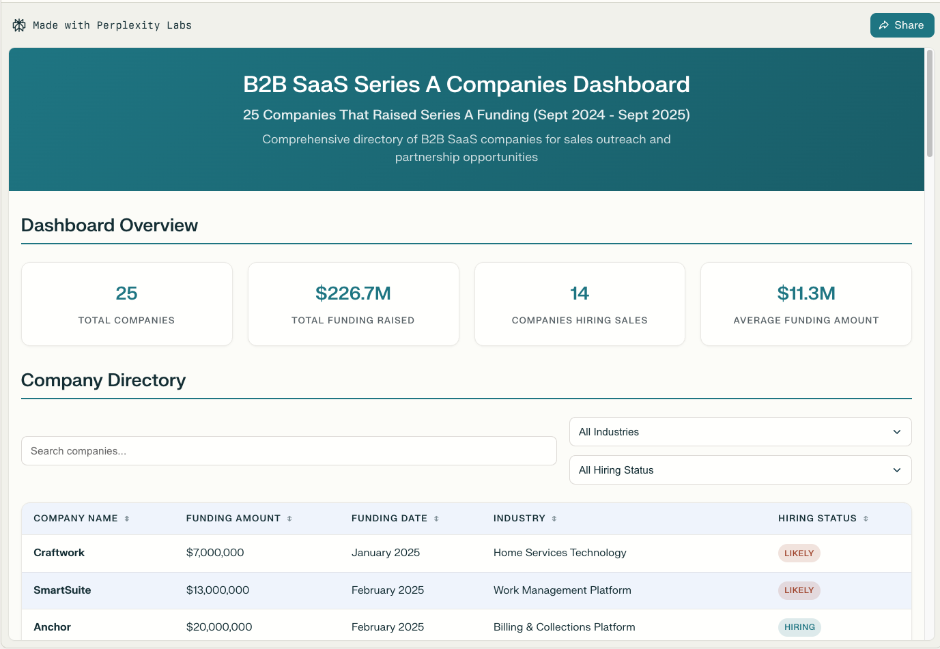 寻找25家在过去12个月内完成A轮融资并正在招聘销售人员的B2B SaaS公司。创建一个包含公司名称、融资金额和联系邮箱的仪表板。然后制作一个可使用的冷邮件外联模板