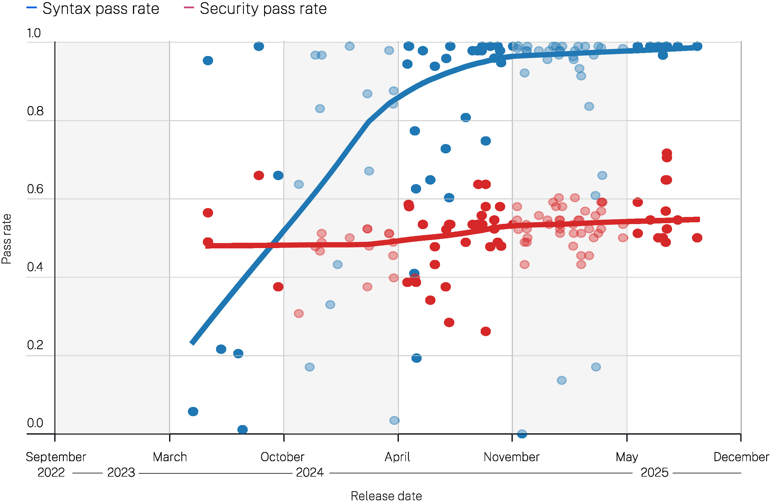 安全性和语法通过率与 LLM 发布日期的关系