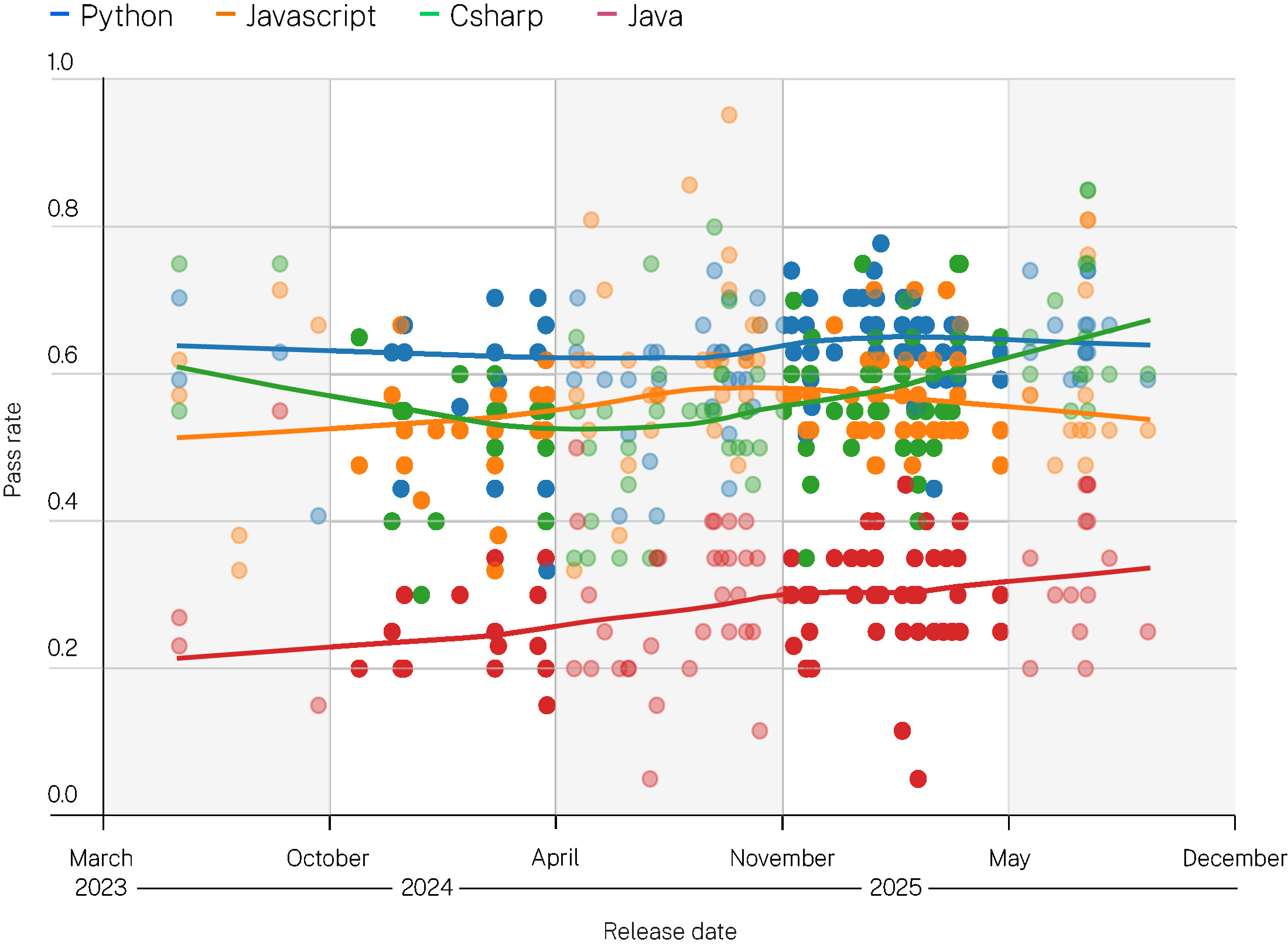 上图中,每个点代表一个模型在某一特定语言任务集上的安全性能表现(例如,Java的所有CWE和任务实例),每个点包含20个任务。X轴按给定模型的发布日期排列。Y轴为安全通过率。点的颜色表示语言类型,线条为最佳拟合趋势线。