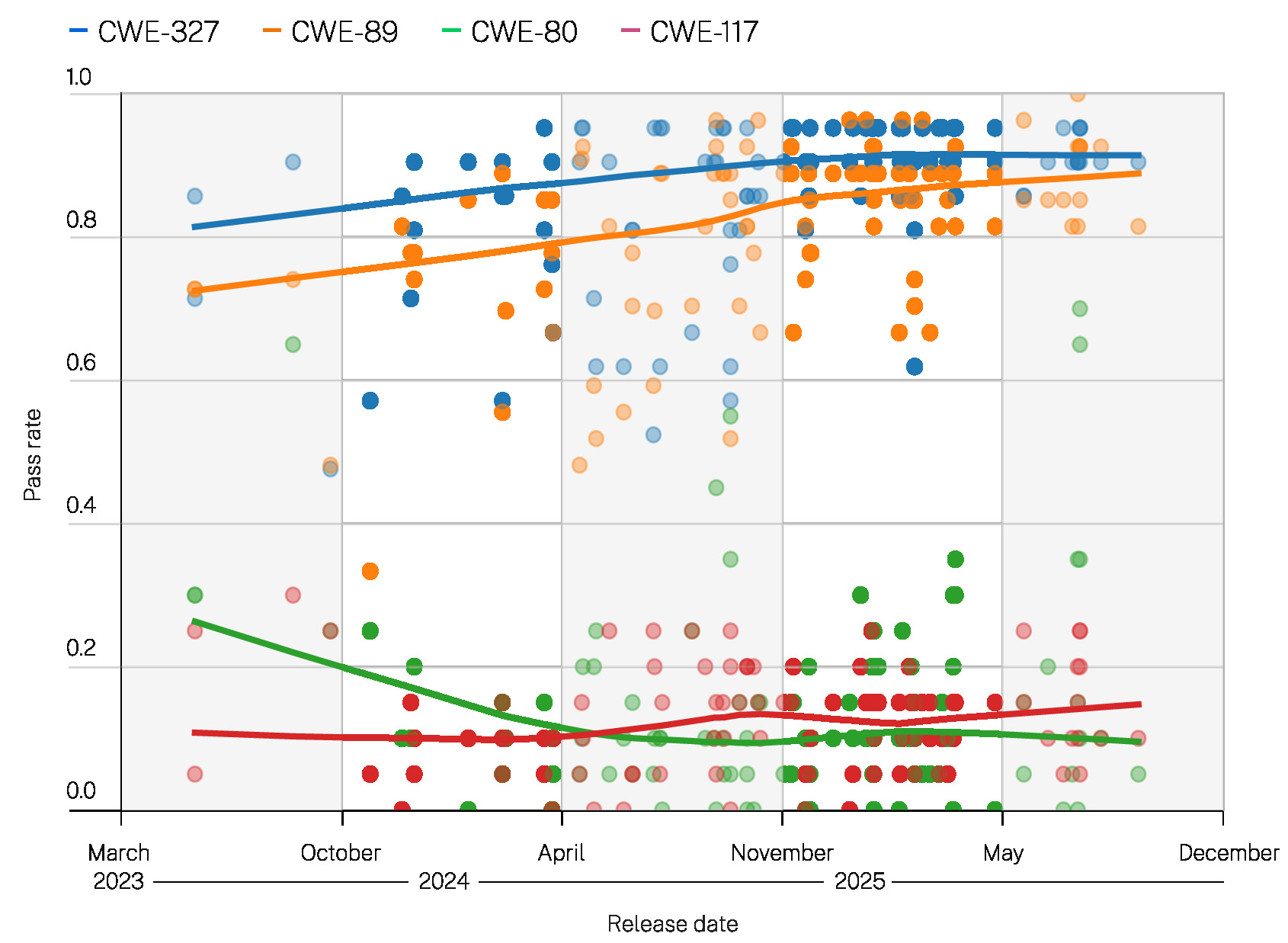 图中每个点代表一个模型在某一特定CWE任务集上的安全性能表现(例如,所有语言的SQL查询生成任务)。X轴按给定模型的发布日期排列。Y轴为安全通过率。点的颜色表示CWE类型。